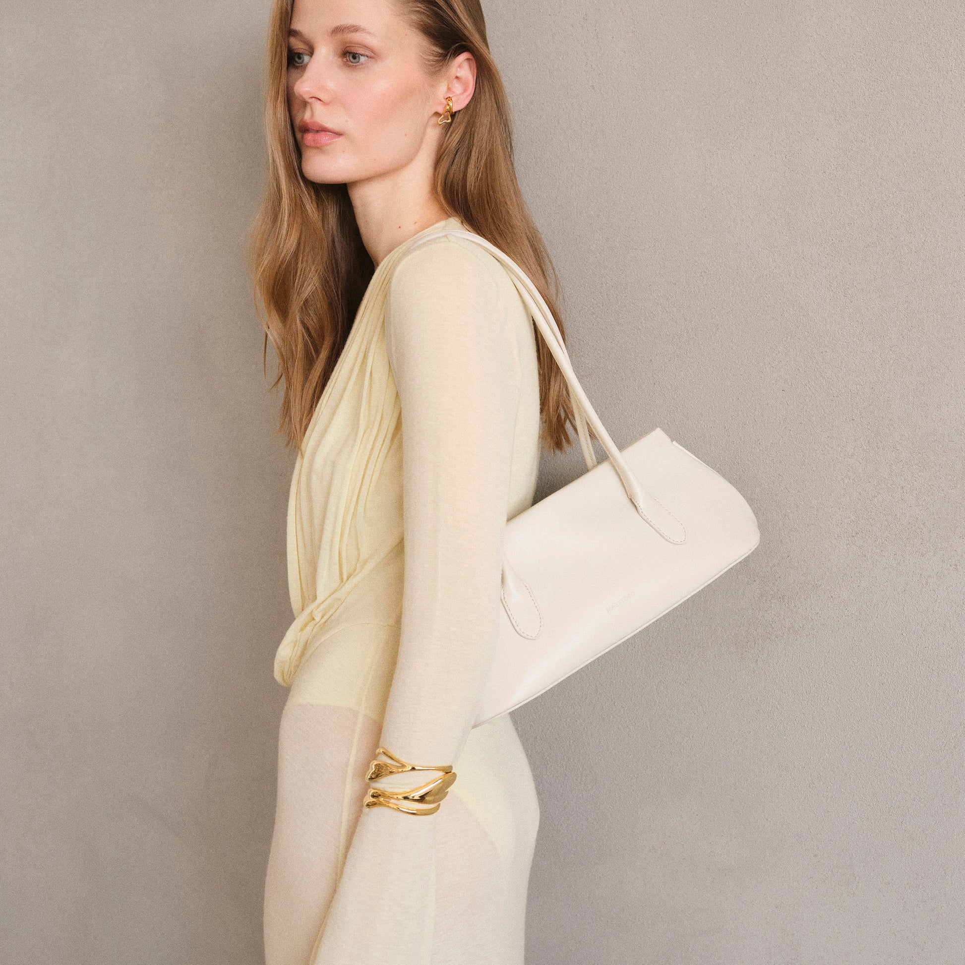 Linear in silhouette, sculptural in spirit. The Aurora Linea reimagines the codes of the Aurora series through a minimalist lens. Its elongated form and softly rounded base evoke a sense of architectural grace, while the two slender top handles emerge seamlessly from the body, maintaining the purity of the line and offering ease and fluidity in movement.