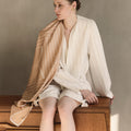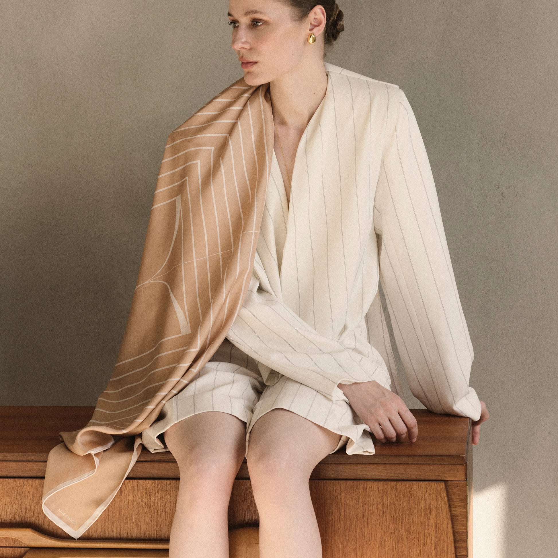 A statement of sculptural elegance, this pure silk scarf places Maison Maestoso’s new monogram at its very heart, two mirrored stylized ‘M’s in perfect vertical symmetry, inspired by the iconic chairs of Constantin Brâncuși’s Table of Silence.