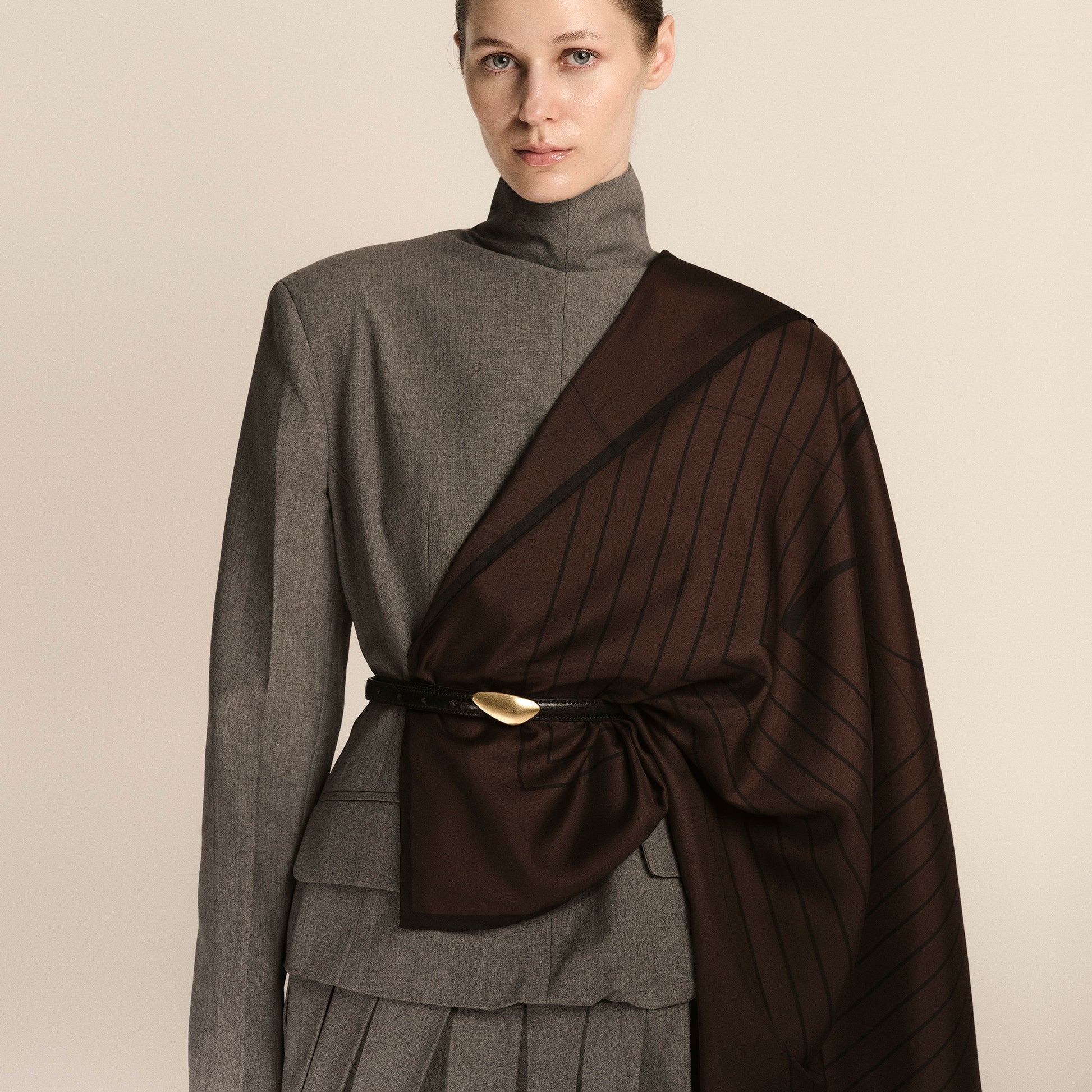 A statement of sculptural elegance, this pure silk scarf places Maison Maestoso’s new monogram at its very heart, two mirrored stylized ‘M’s in perfect vertical symmetry, inspired by the iconic chairs of Constantin Brâncuși’s Table of Silence.