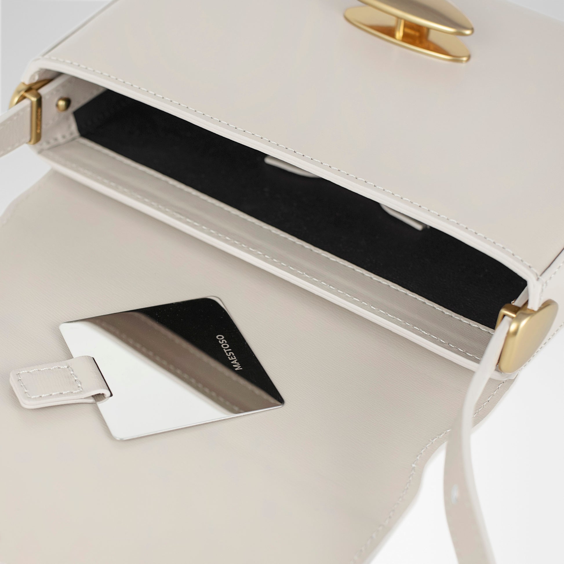 A beautiful detail shared by all handbags in the Gaia Collection, the Noa Baguette features a personalized mirror inside. An elegant secret that enhances its intimate character and discreet luxury.