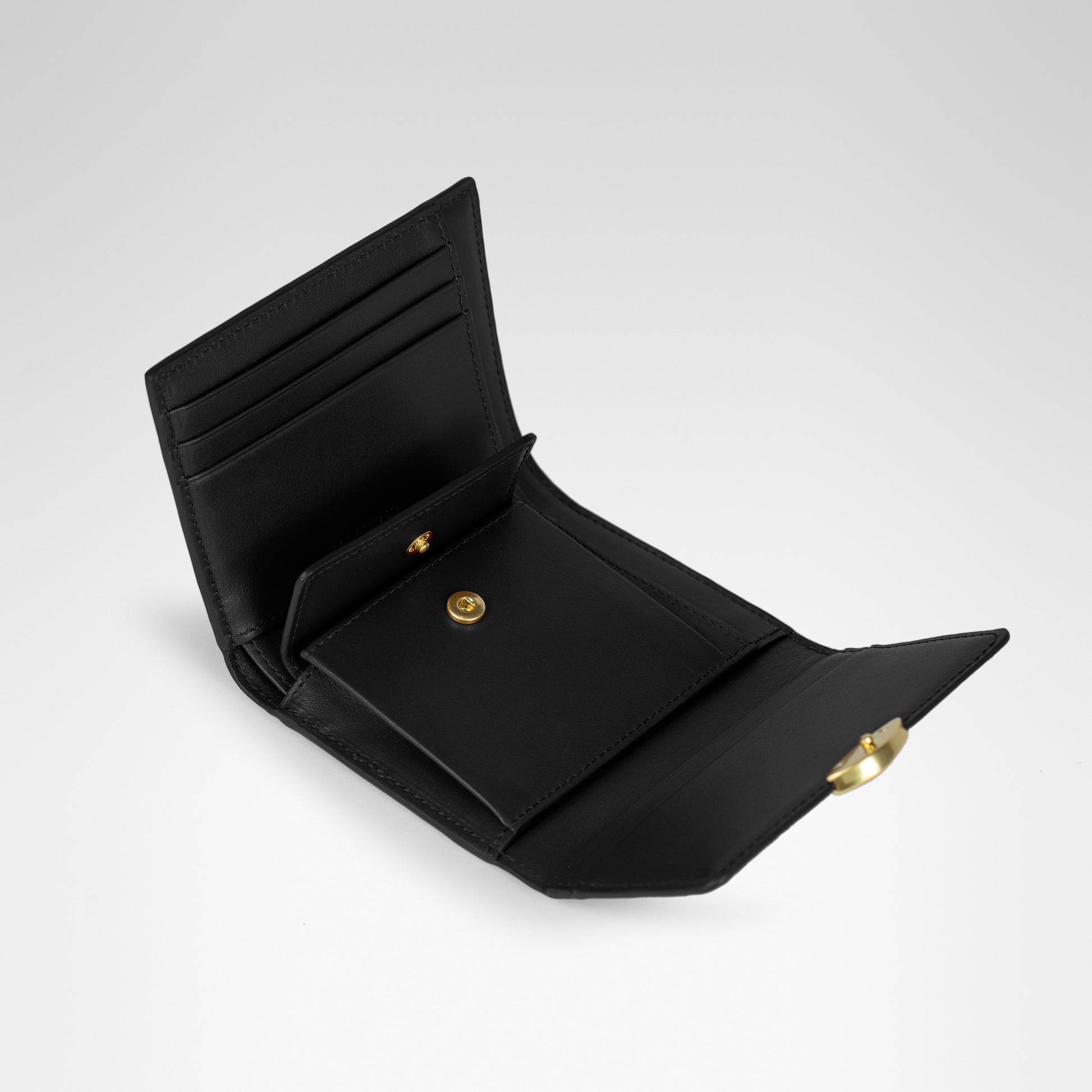 La interior, organizarea este gandita pentru utilizare zilnica fara efort. Portofelul se deschide pentru a dezvalui un buzunar lung pentru bancnote, cinci sloturi pentru carduri pentru acces rapid si un compartiment pliabil pentru monede, inchis cu capsa. Toate compartimentele sunt atent dispuse pentru a pastra totul ordonat, mentinand in acelasi timp un profil suplu si aerisit.
